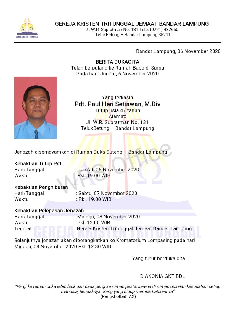 Jenazah disemayamkan di rumah duka Suteng Bandar lampung.