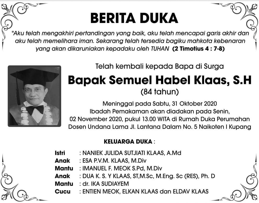 Telah berpulang  Bapak Samuel Habel Klaas, ayah mertua GI.Imanuel F.Meok (masta 98)
