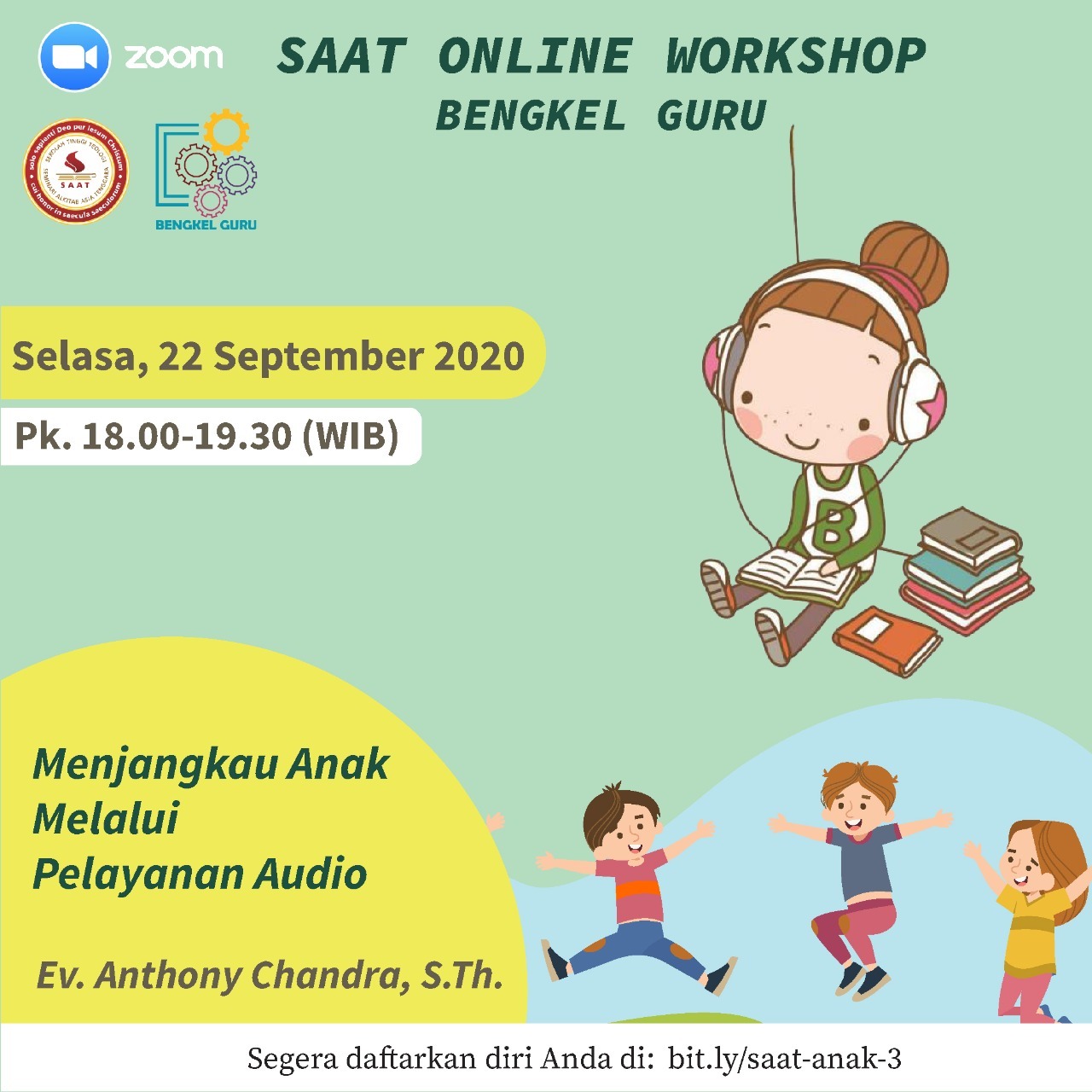 Tidak semua keluarga bisa mengunduh program-program pelayanan anak melalui media video. Keterbatasan internet, seringkali menyebabkan guru-guru sekolah minggu mengalami kesulitan menjangkau murid-muridnya. Untuk itu, Ev. Anthony Chandra, yang biasa menyiarkan program boneka Sukri bersama boneka Hai-hai (Ivonne S. Setandi), melalui Podcast (audio), akan berbagi prinsip, ketrampilan, dan tips bagaimana menyampaikan pesan firman Tuhan untuk menjangkau anak melalui media audio.