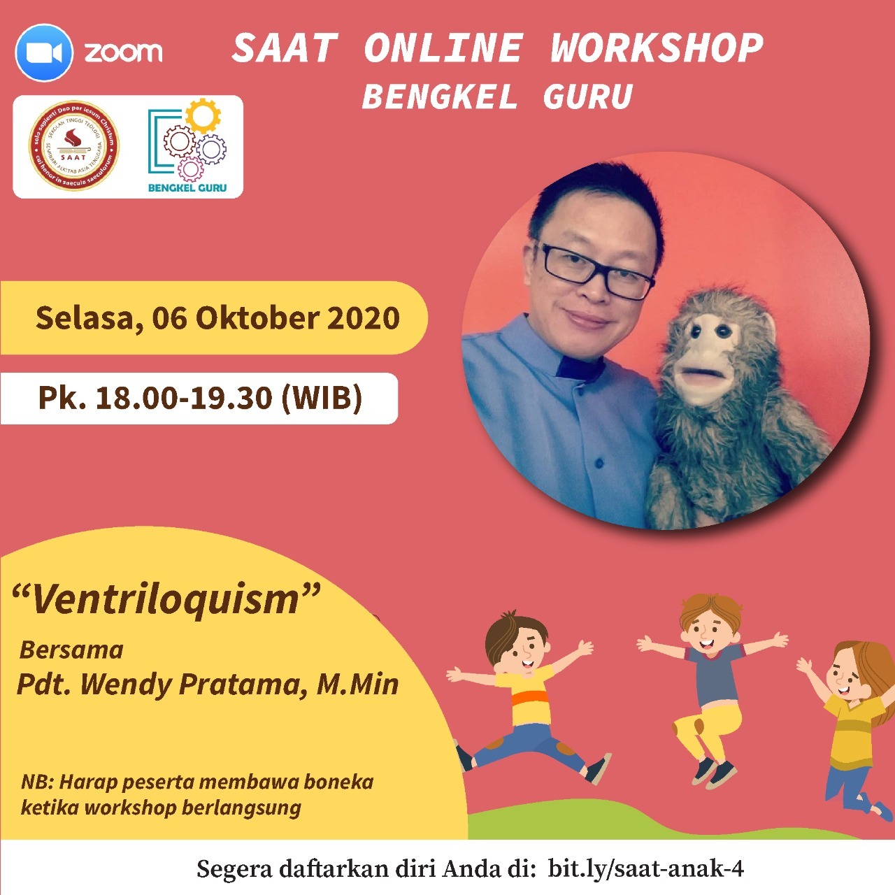 Pdt. Wendy akan membantu kita mengenal sedikit ketrampilan dasar ventriloquism, yaitu teknik memainkan boneka sebagai rekan mengajar (friend-puppet). Bagaimana supaya bibir tdk terlalu terlihat bergerak, bagaimana supaya lafal terdengar jelas? Bagaimana membuat puppet menjadi hidup dan terpisah dengan pemainnya?